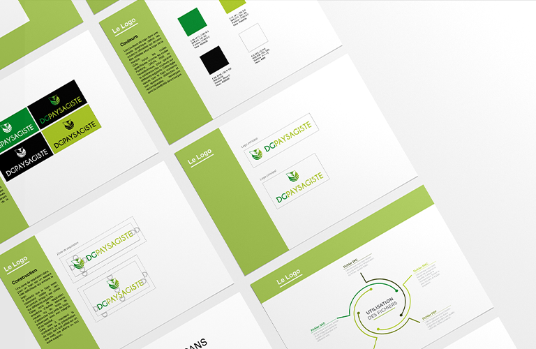 La charte graphique que j’ai développée pour DGPAYSAGISTE est un ensemble de directives visuelles visant à assurer la cohérence et la reconnaissance de la marque dans toutes ses communications. Elle comprend des instructions sur l’utilisation du logo dans différentes situations, notamment en couleur et en noir et blanc, ainsi que des règles concernant les marges de sécurité et les proportions.