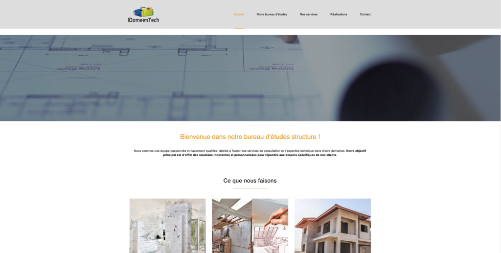 La conception du site web de DomeenTech a été pensée avec la même rigueur technique et le même souci d’excellence que le bureau d’études apporte à ses projets de structures. Chaque élément visuel, chaque ligne de code, est une extension de l’expertise et de la précision caractéristiques de DomeenTech.